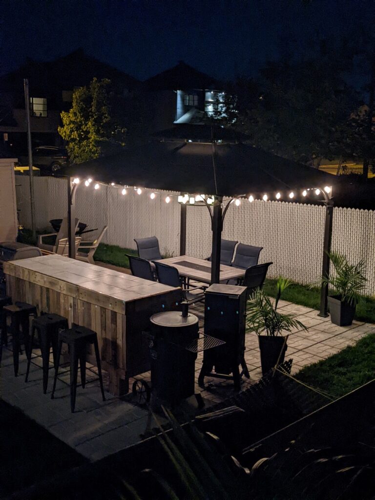 Vous pensiez vraiment que j’allais en rester là ! Printemps 2022, le beau temps s’installe, la chaleur se pointe et les restrictions sanitaires tombent l’une après l’autre. Je décide d’adopter de nouveau; le « Big Joe » a fait son entrée dans la famille. Mais une grosse famille demande de l’espace pour loger tout le monde. Rappelez-vous que ma vision de ce genre de cuisine est de se rassembler et d’en profiter tous ensemble. Je me devais de créer un endroit où j’allais pouvoir recevoir tout un chacun pour profiter de tout ceci. L’espace bar/cuisine extérieure était inévitable.
